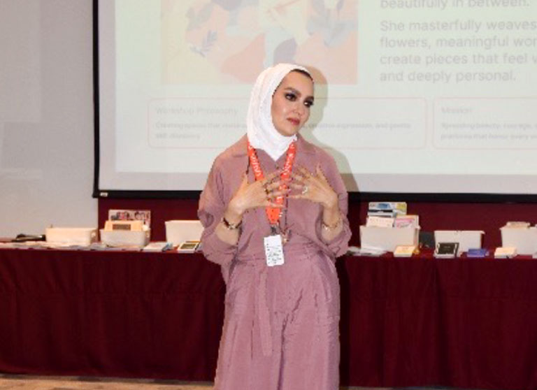 Dr. Smadi and Dr. Al Mutairi welcomed attendees and introduced the workshop facilitator, Ms. Fatima Al Loghani, a distinguished collage artist, marketing director, and entrepreneur. Ms. Al Loghani is also the founder of Coco Collage, a platform that promotes self-expression and mental well-being through the art of collage. Under her guidance, students were encouraged to engage in an introspective and therapeutic creative process that allowed them to reflect on their personal growth, emotions, and aspirations.
